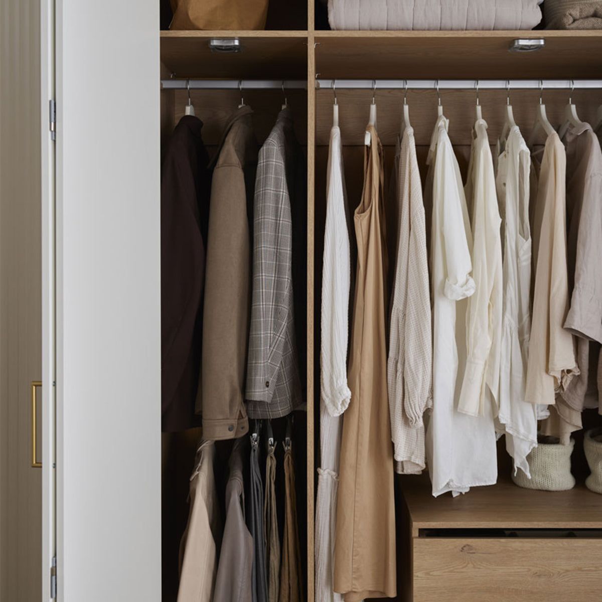 • Easy: 3 горни фиксирани рафта, 3 релси за дрехи (2 за къси и 1 за дълги дрехи), 5 регулируеми рафта вдясно и 2 по-широки рафта в средата.