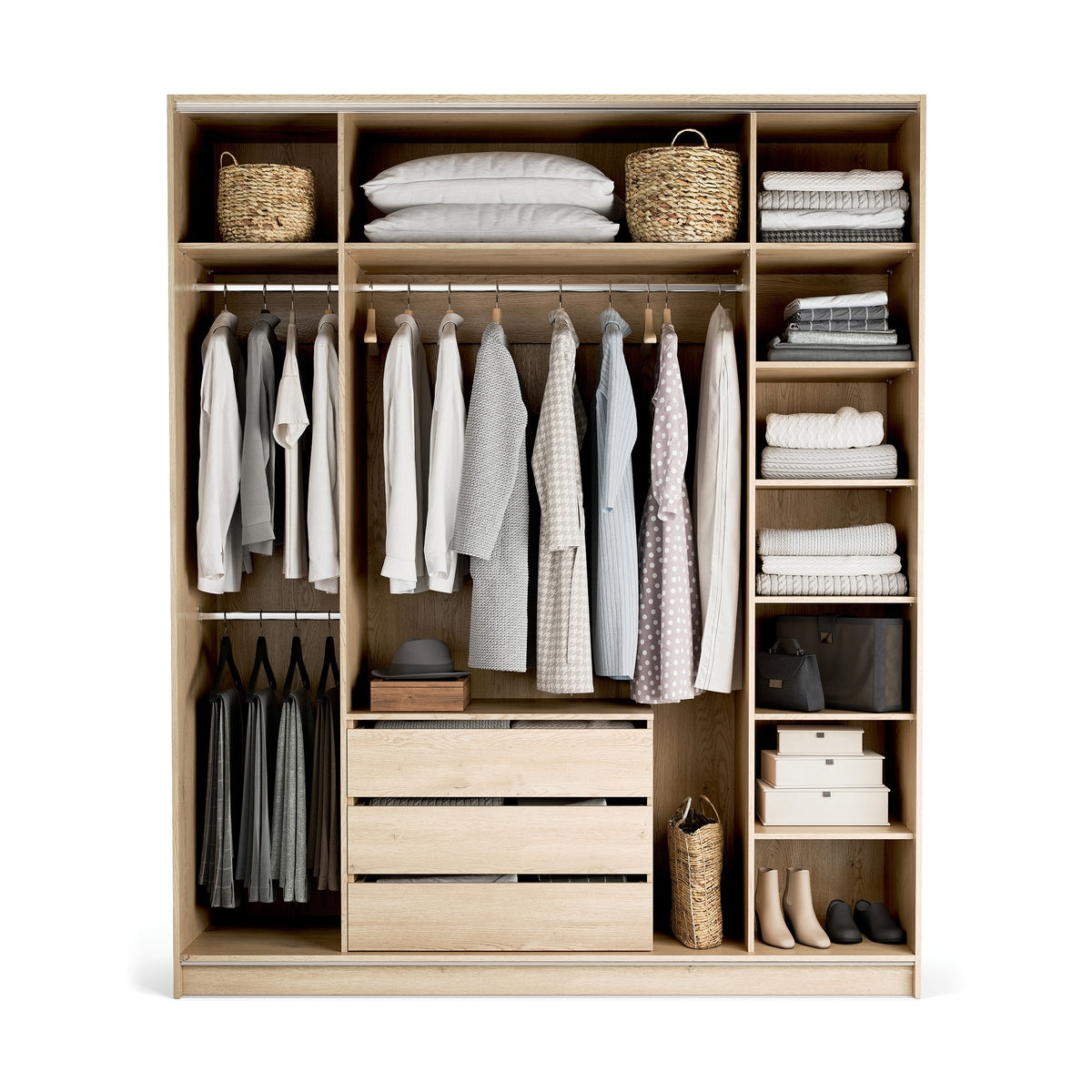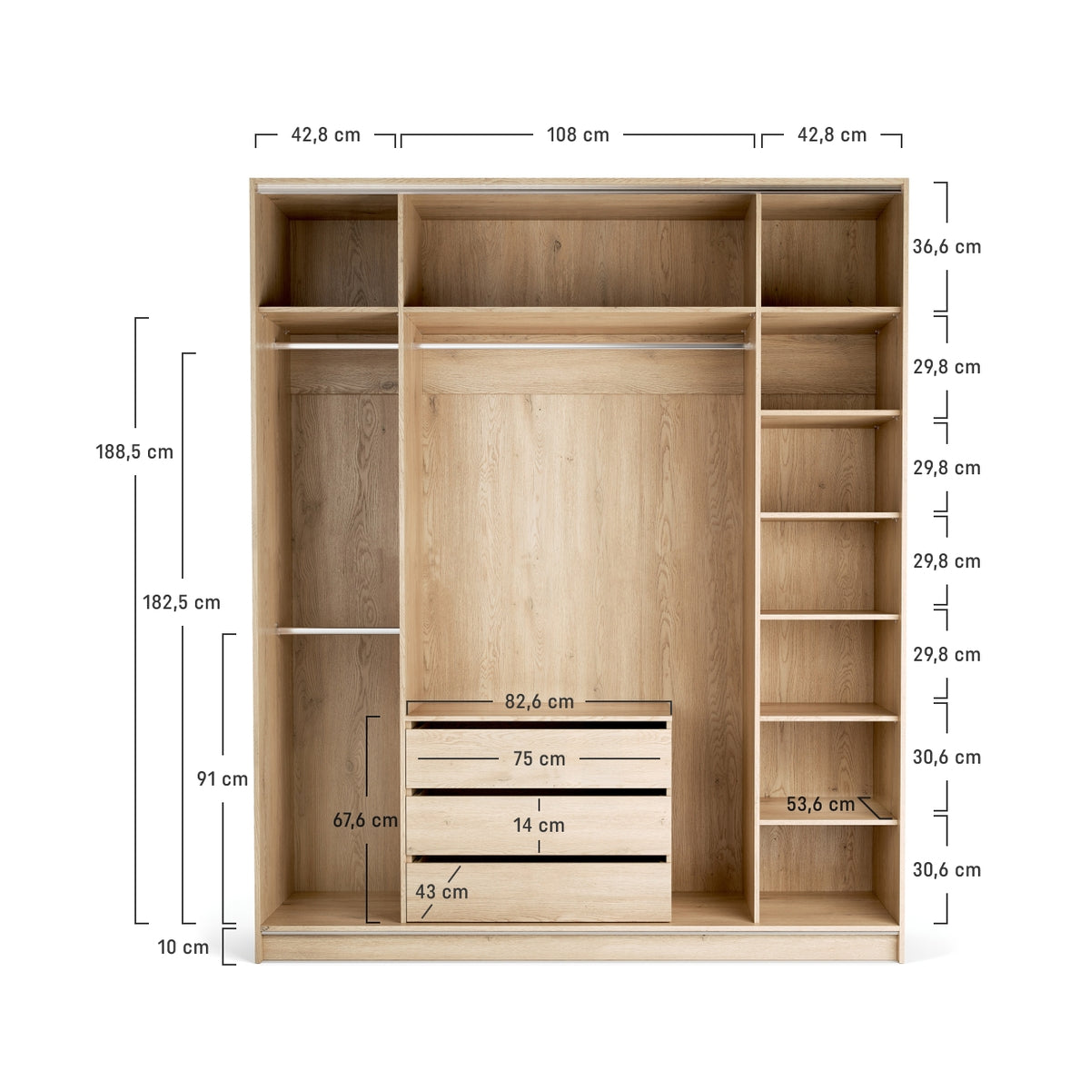• Maxi (само за височина 240 см): ляво отделение с рафт, релса и издърпваща се закачалка за панталони; средна част с пантограф и чекмеджета; дясна зона с фиксиран горен рафт и 5 регулируеми рафта.