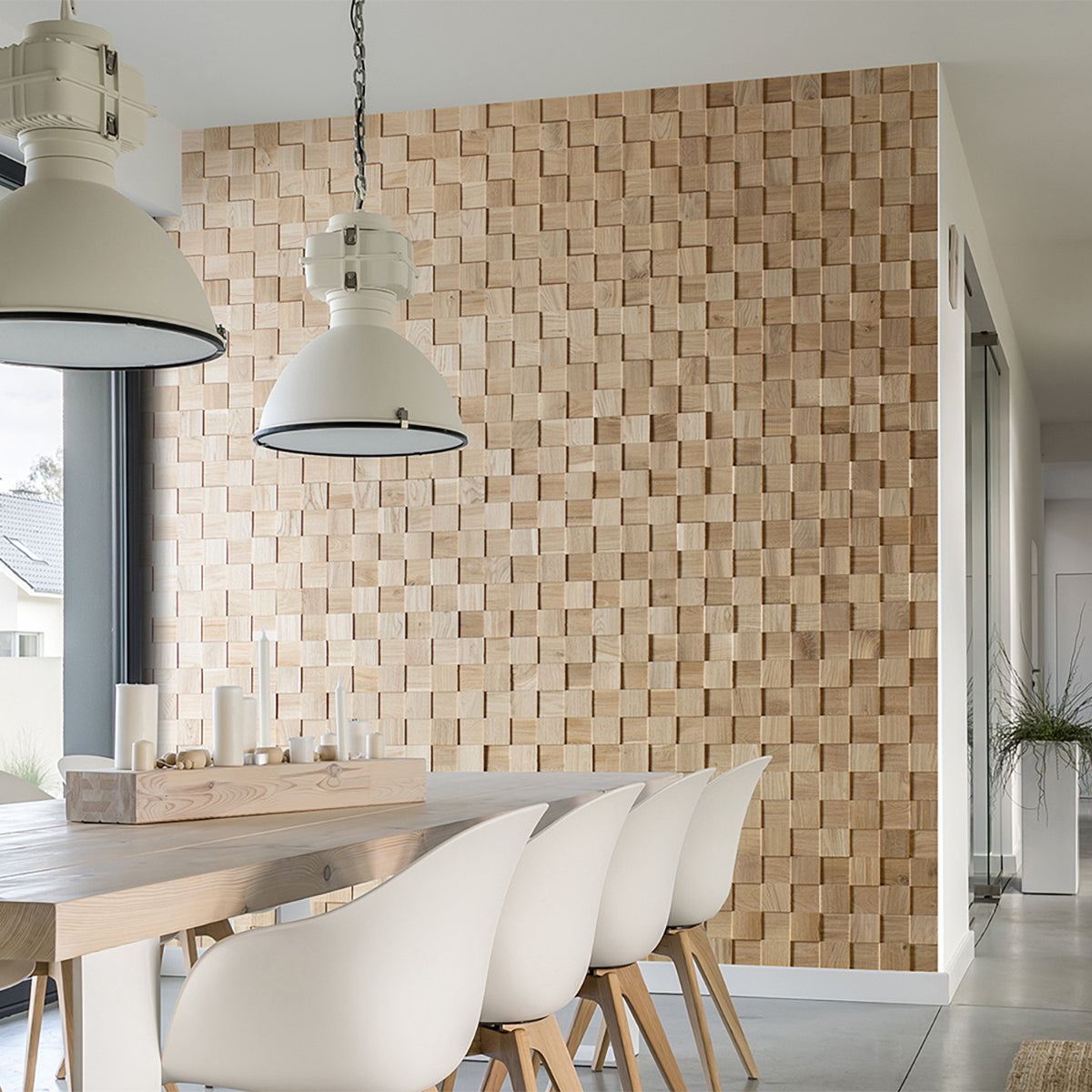 Стенен панел "CHESS" е изработен от масивна дъбова дървесина, която е комбинирана, за да създаде 3D стенен панел. За да се подчертае естественият цвят и структура на дъба, повърхността е изчеткана. Независимо дали искате да добавите акцент или да покриете цялата стена или таван, дъбовите панели могат да ви дадат вида и усещането, които искате.