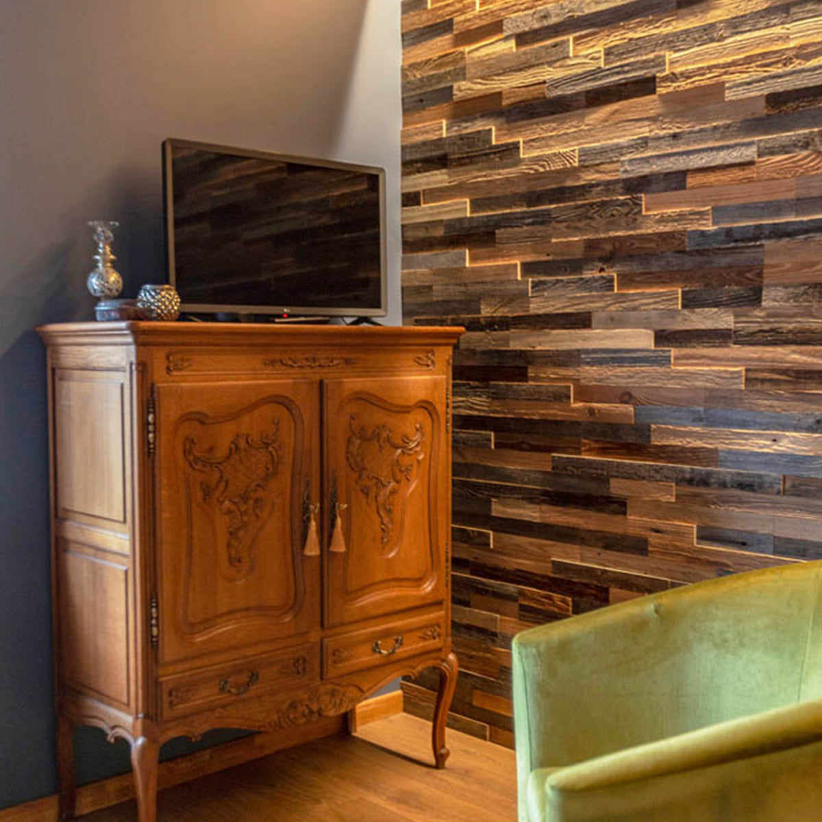 Стенен панел "LARGO" е изработен от регенерирана дървесина. Този материал обикновено идва от стари хамбари и мелници, където дъските са били под въздействието на вятър, дъжд и слънце в продължение на десетилетия. Внимателно обработени и почистени с най-голямо внимание към цвета и текстурата. След четкане с машини, получаваме уникална текстура и цвят, които не могат да бъдат създадени изкуствено. Матираната повърхност има приятен, топъл, кафеникав тон. В резултат на това те са чудесни за функционална стена за всеки интериорен дизайн.