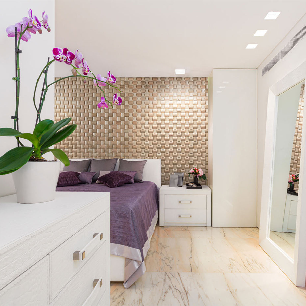 Помислете за добавяне на стенни лампи или светодиодни ленти, за да подчертаете текстурата на стенния панел. Естествената светлина от прозорците също е чудесен начин да я разширите.