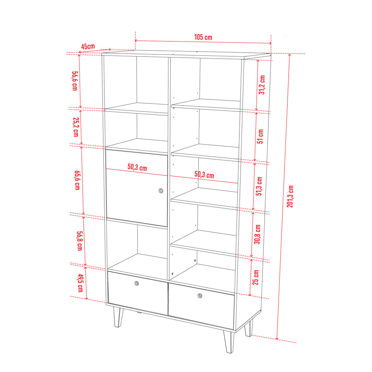 - Височината на петте отворени рафта може да се регулира свободно, което Ви позволява да организирате пространството според Вашите нужди. В тях ще поберете учебници, тетрадки, албуми или любими поредици от романи.
