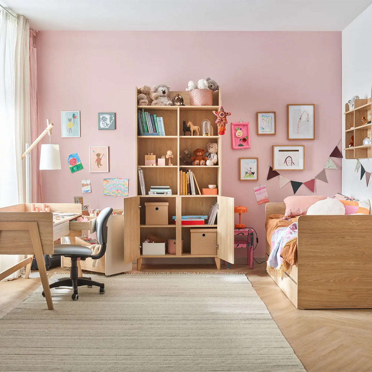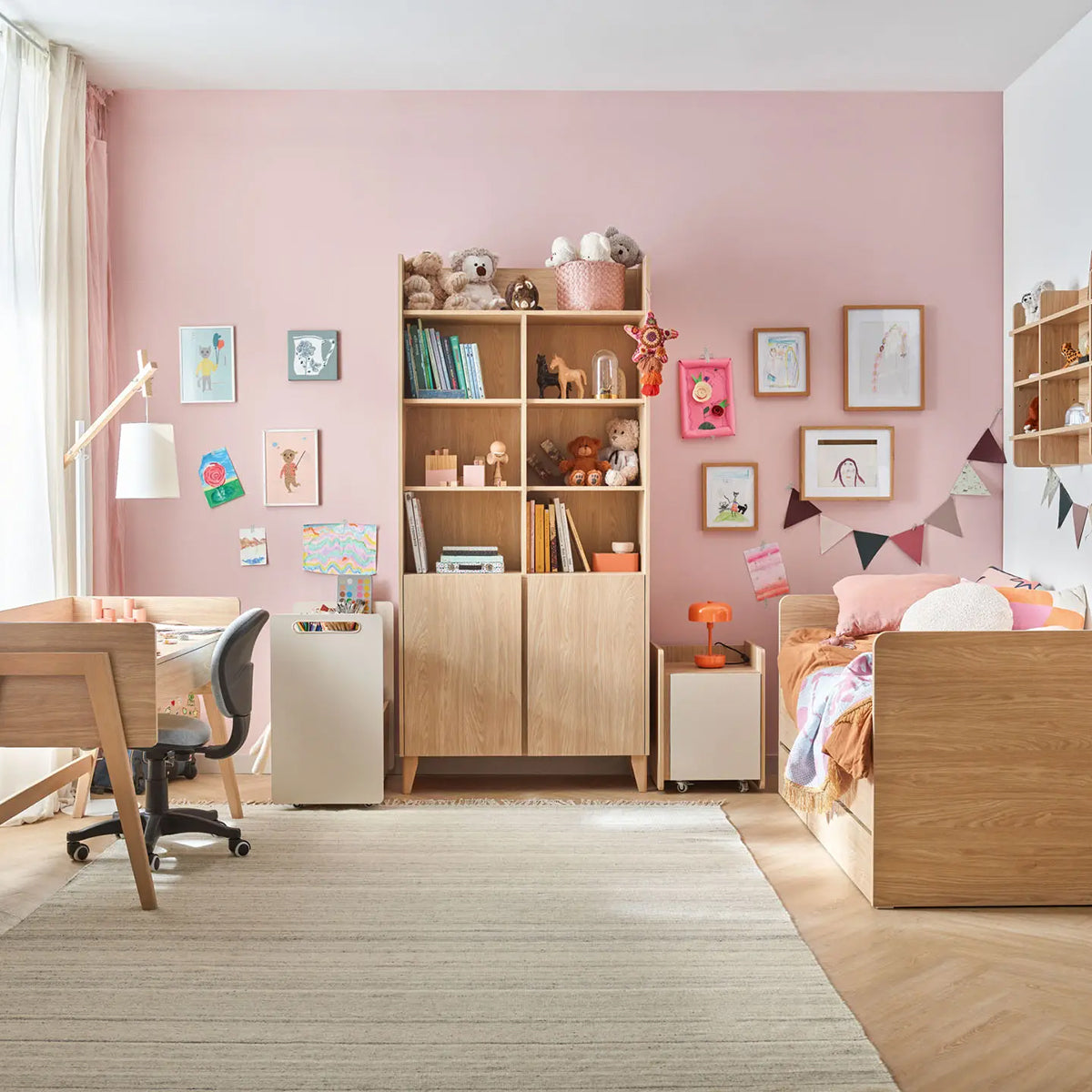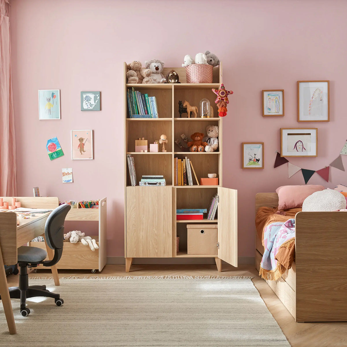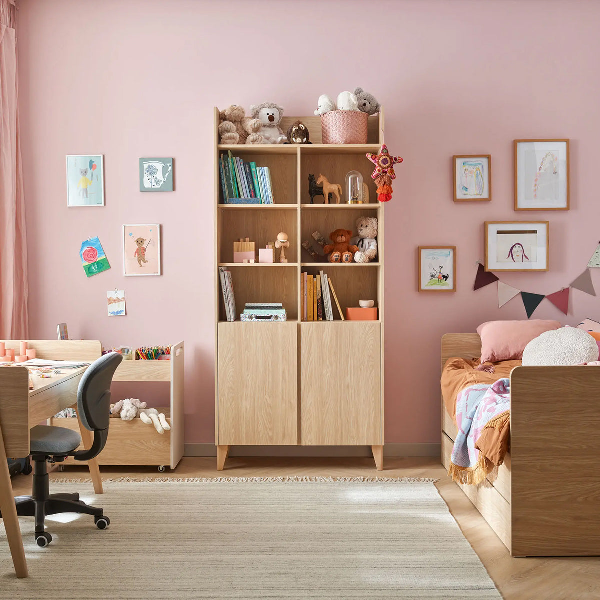 Широката библиотека Muve е практично и стилно решение за организиране на пространството в детската, младежката или всекидневната стая. Съчетавайки открити и затворени секции, тя предлага функционалност и визуална лекота, като същевременно може да бъде персонализирана според интериора.
