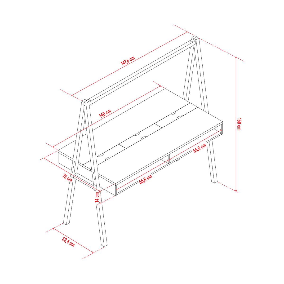 - От предната и задната страна на бюрото има 4 ниши, които могат да се използват като допълнително място за съхранение на книги, бележки и необходими аксесоари. Нишите могат да бъдат запълнени с практични чекмеджета (закупуват се отделно);
