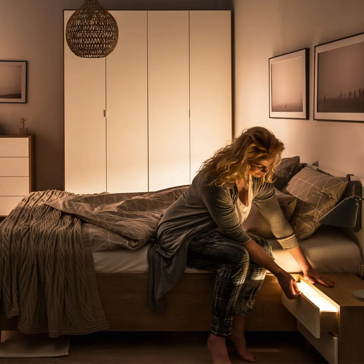 Вътре в гардероба са монтирани 3 LED лампи с сензори за движение, които се активират при отваряне на вратата. Те осигуряват дискретно осветление, което ви позволява да извадите дрехи без да осветявате цялото помещение.