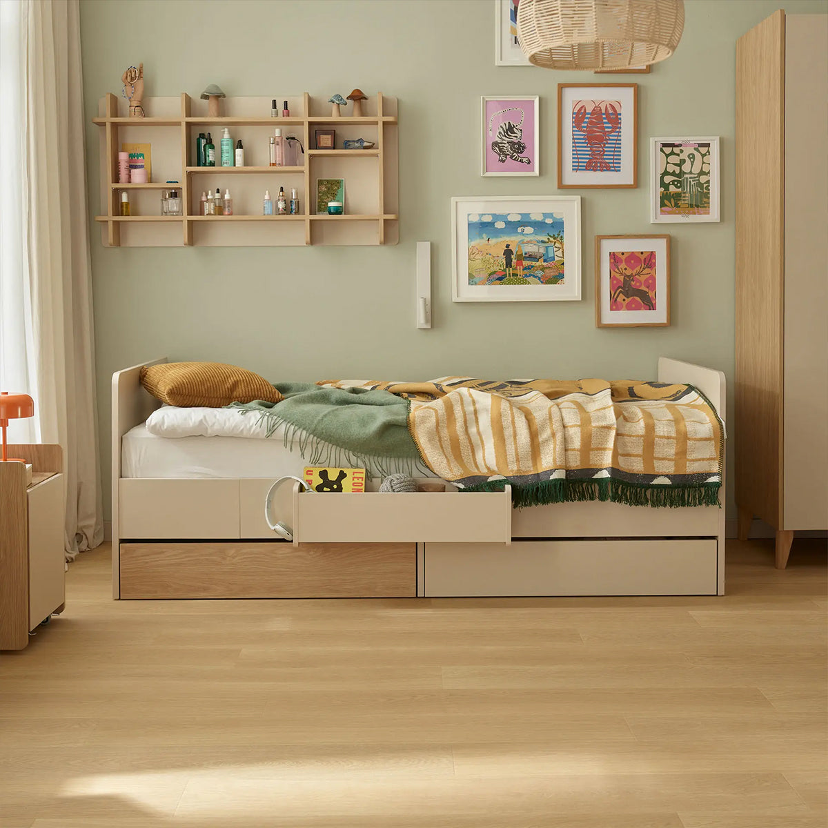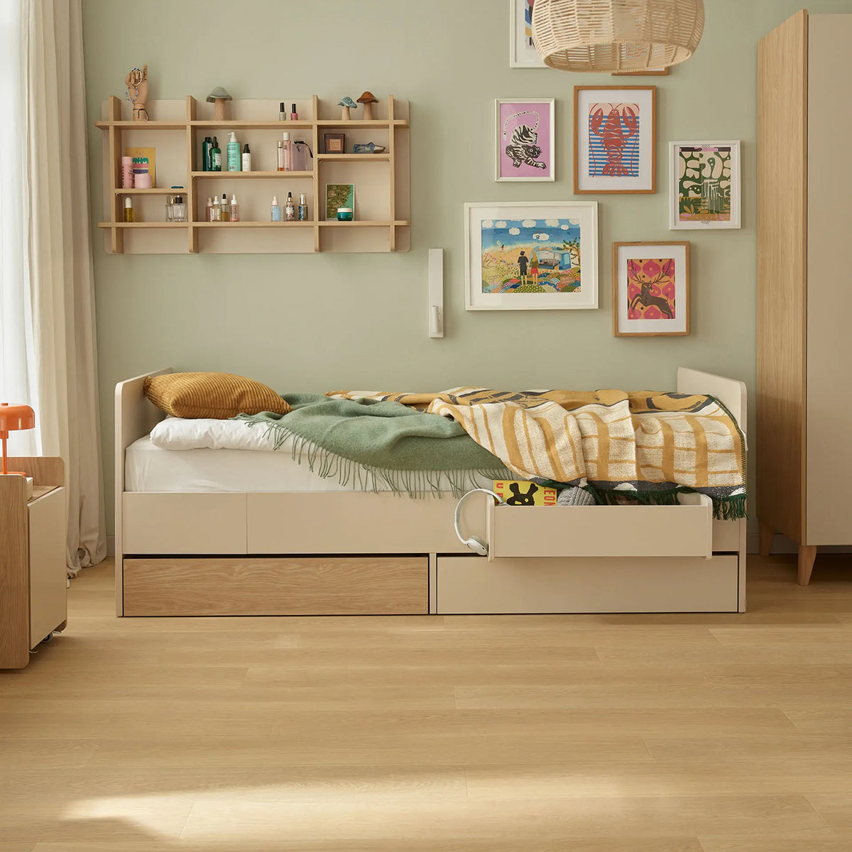 Етажерката за легло Muve е интелигентно и практично решение за съхранение, което не изисква допълнително място. Тя се монтира директно към рамката на леглото и осигурява удобно пространство за дребни предмети, които трябва да са под ръка – като книга, телефон или чаша вода.