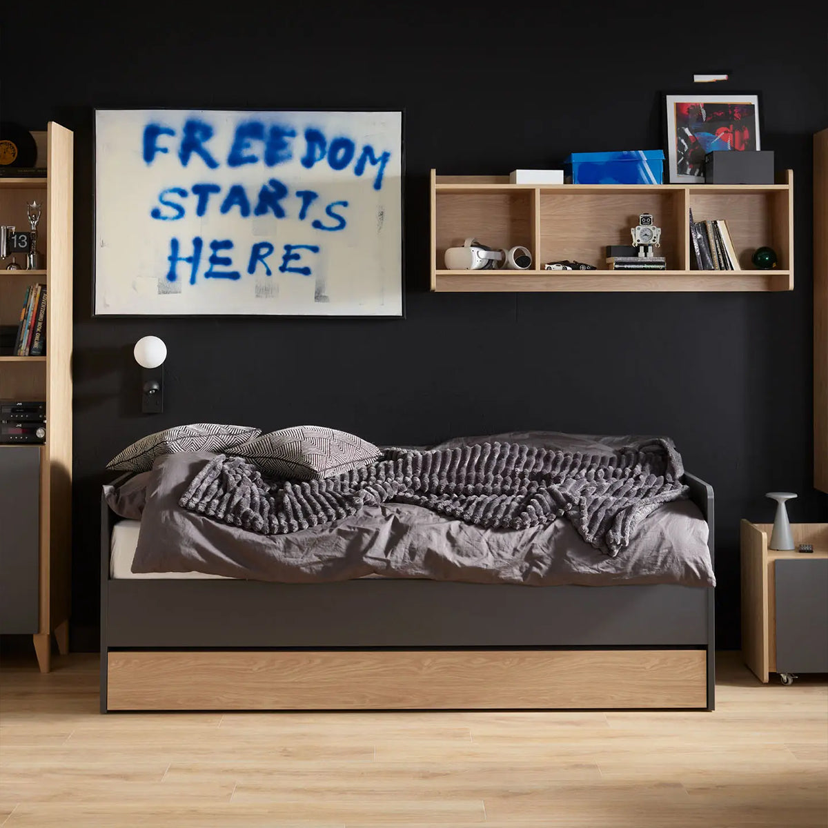 Етажерката за стена Muve е стилно и функционално решение за съхранение над бюро или легло. Тя помага за поддържане на реда, като същевременно предлага място за любимите книги, аксесоари или дребни предмети, които искате да изложите.