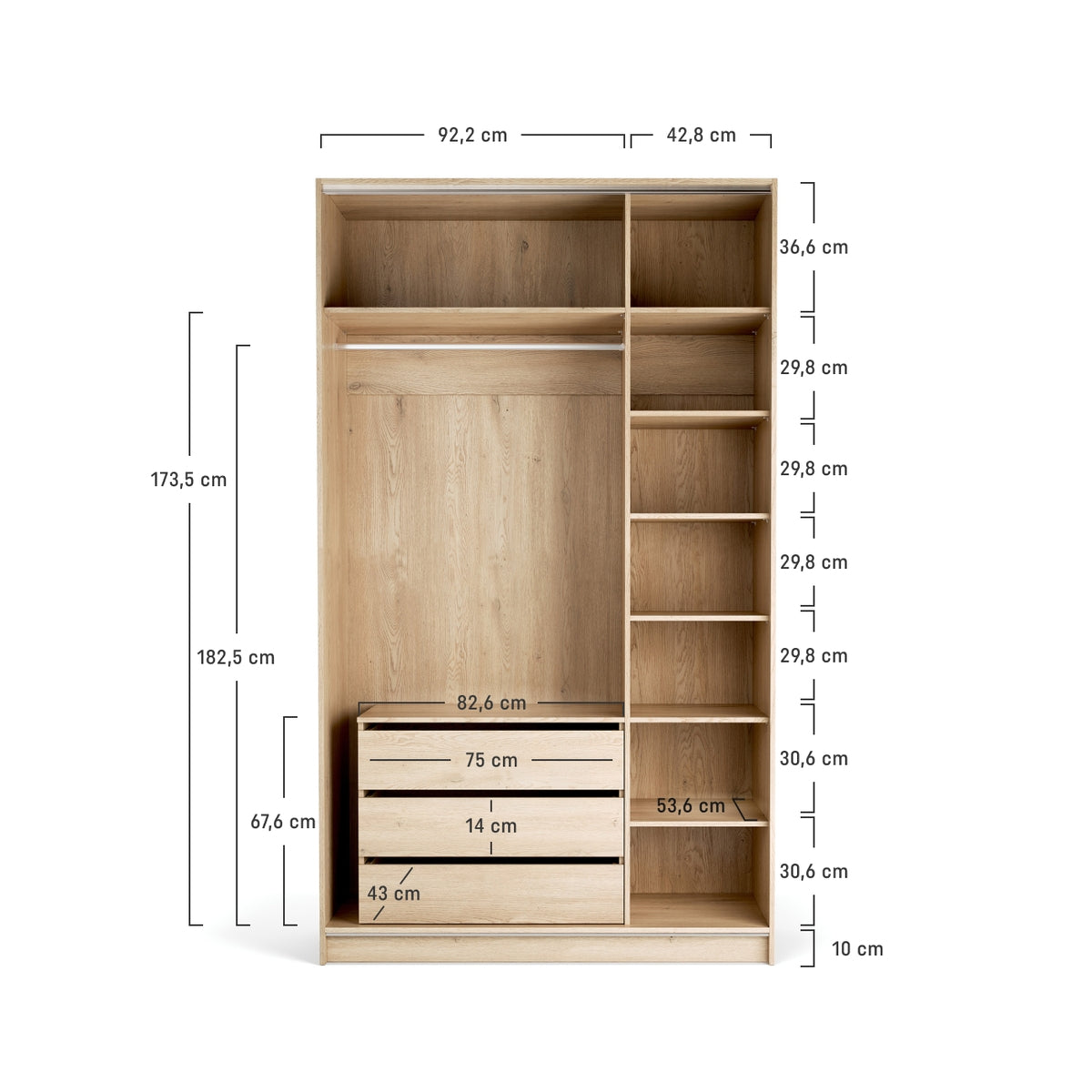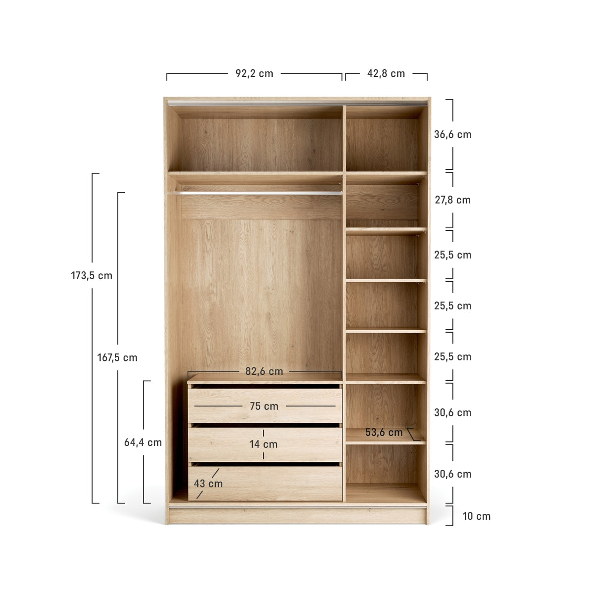 Гардеробът се предлага в две височини – 225 см и 240 см, и може да бъде използван самостоятелно или в комбинация с други модули от колекцията Stor. Добавянето на страничен гардероб или модул в различен цвят създава интересен визуален ефект и увеличава мястото за съхранение.