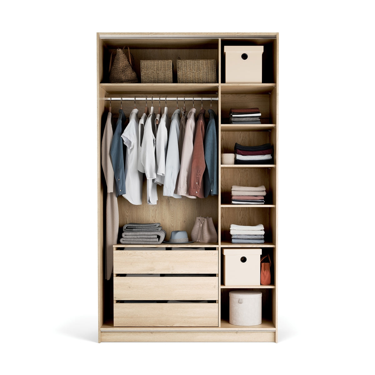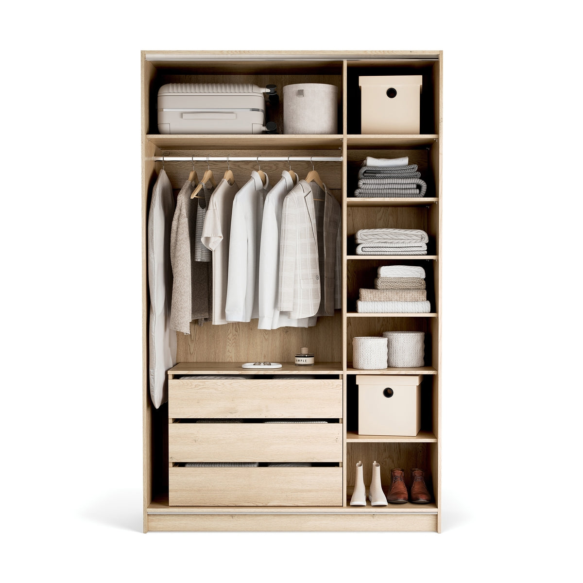 • Maxi: 2 фиксирани горни рафта, 1 релса за закачалки, 5 регулируеми рафта и контейнер с 3 чекмеджета – идеален за аксесоари и бельо.