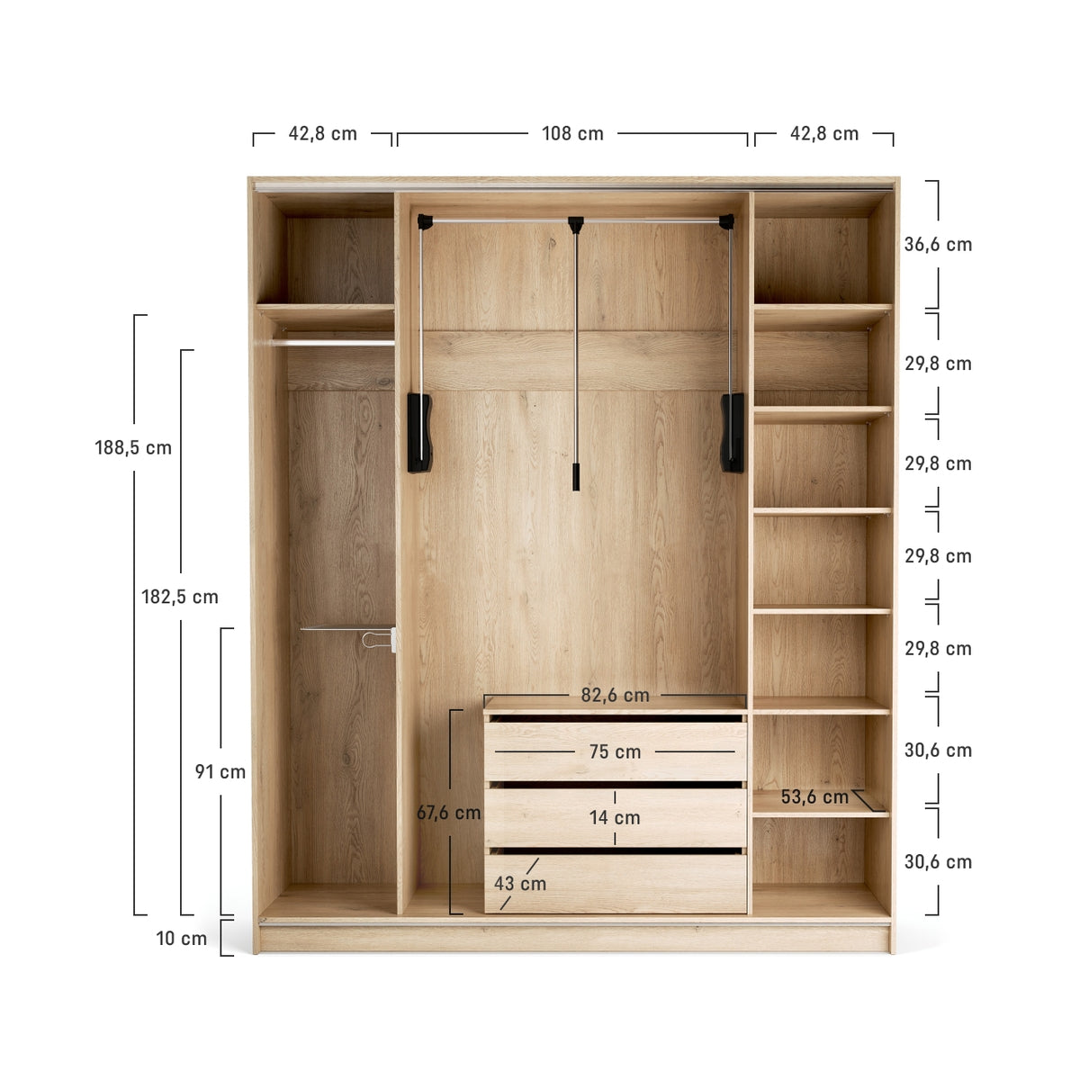 Comfort: 3 фиксирани рафта, 3 релси, контейнер с 3 чекмеджета (разположен отляво или отдясно), свободна зона за окачване на много дълги дрехи или съхранение на обемни предмети.
