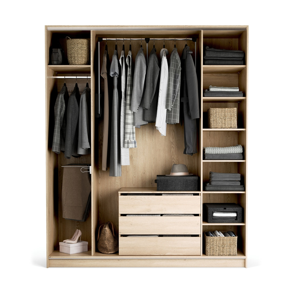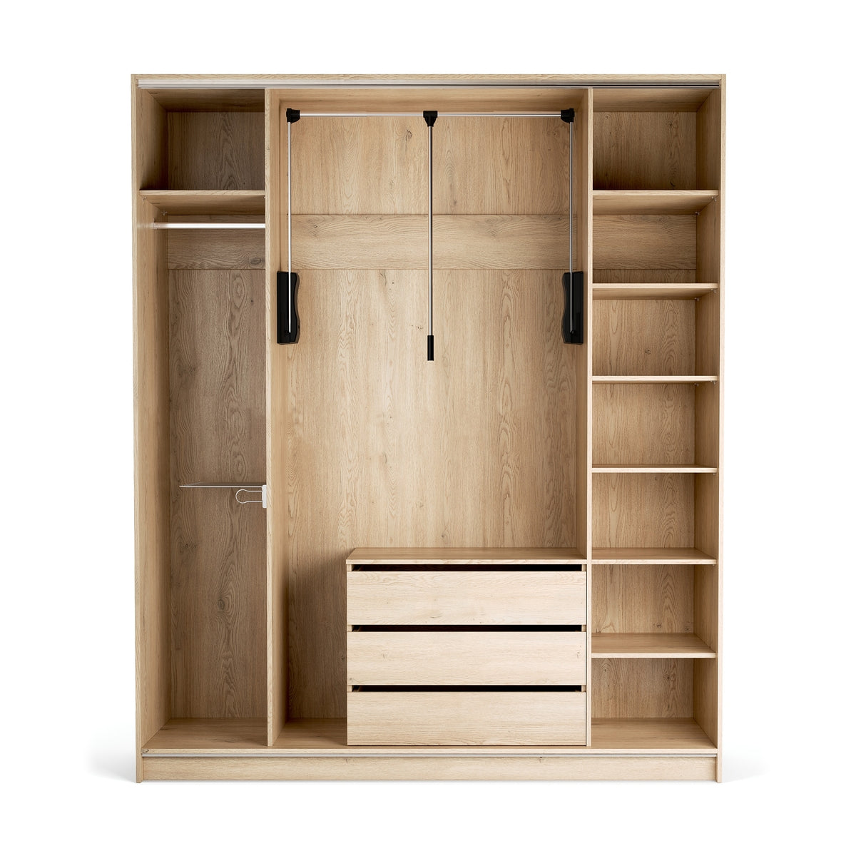 Maxi (само за височина 240 см): ляво отделение с рафт, релса и издърпваща се закачалка за панталони; средна част с пантограф и чекмеджета; дясна зона с фиксиран горен рафт и 5 регулируеми рафта.