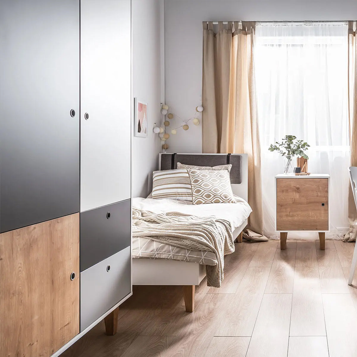 - В долната част на гардероба има малък шкаф за всякакви други необходими вещи - игри, играчки или спортни аксесоари. Цветът на предната му част се определя на етап покупка - има цели 6 различни варианта за избор. Благодарение на това гардеробът ще отговаря перфектно на вкуса и декора на стаята Ви. Такава вратичка може по-късно да бъде закупена отделно и заменена ако решите да променяте интериора на стаята;