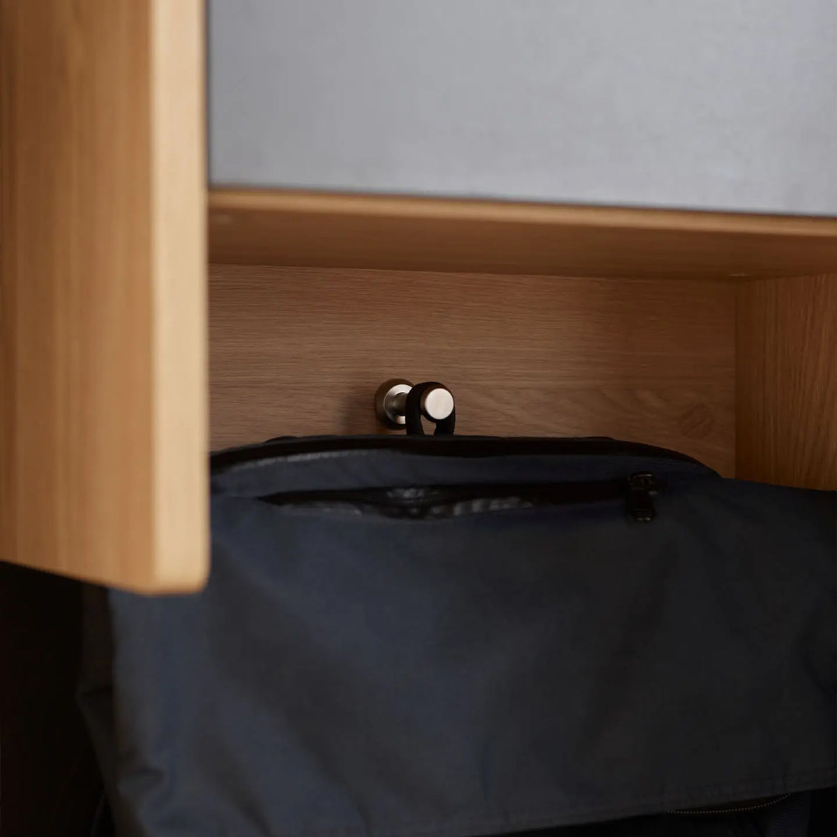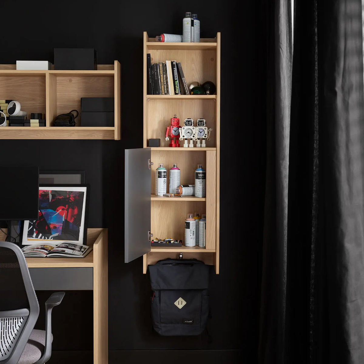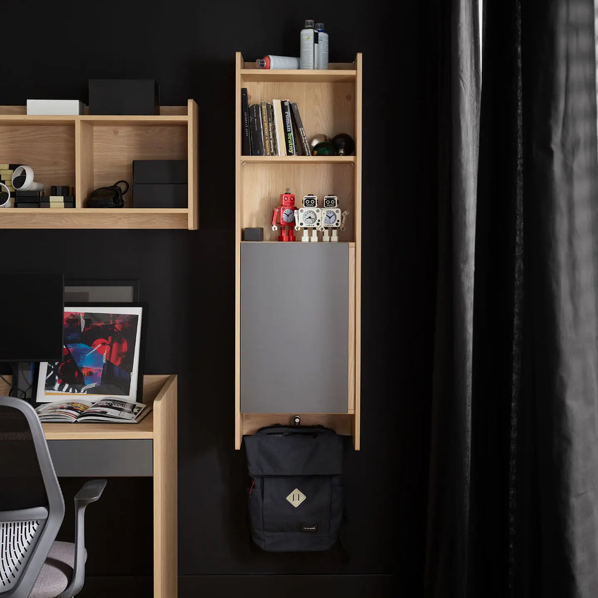 С колоната за стена Muve лесно ще организирате книги, аксесоари и декорации, без да заемате място на пода. Комбинацията от отворени рафтове и затворен шкаф позволява балансирано съхранение и естетика, а вградената кука улеснява окачването на раници или чанти.