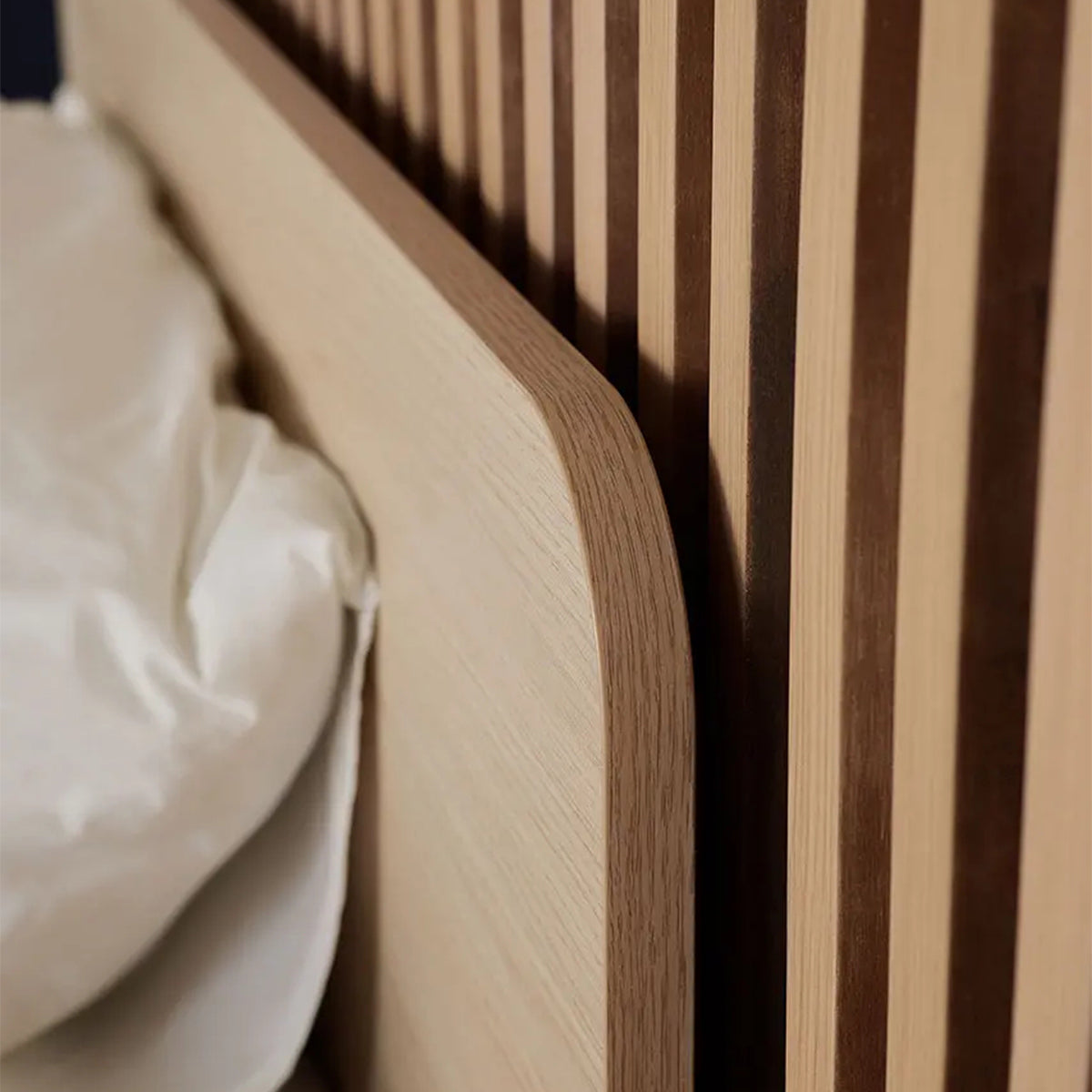 Класическото легло от колекция OMM пленява със своите детайли - приятно заоблена табла, овални крака от масивен дъб и фина дървесна шарка.