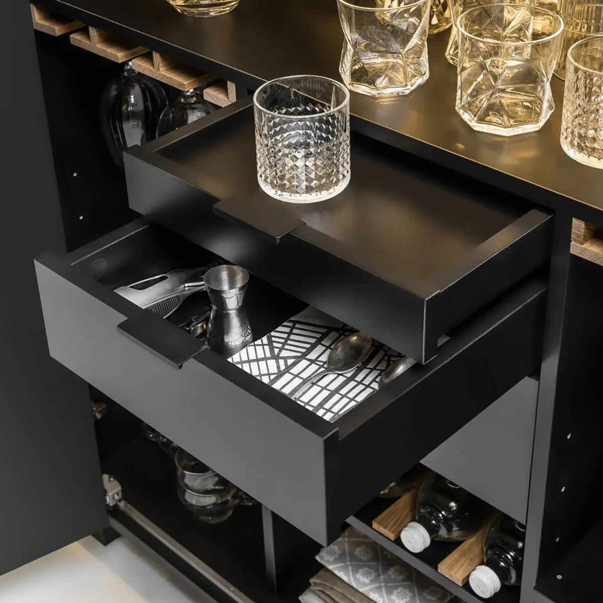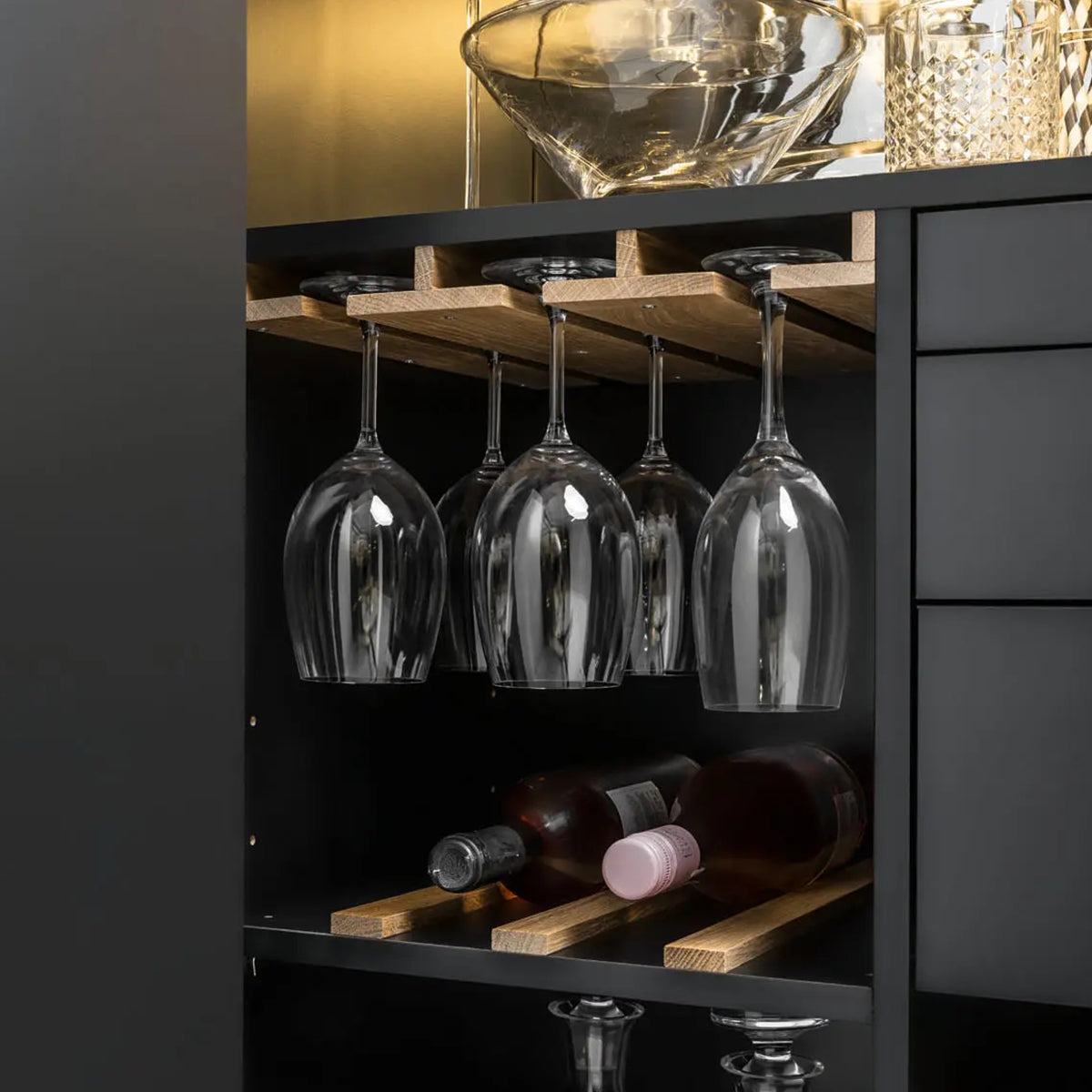Шкафът разполага с две зони с дървени дръжки за закачане на чаши и три регулируеми рафта за съхранение на бутилки в легнало положение. Рафтовете могат да се обърнат, за да се получат прави рафтове, според предпочитанията.