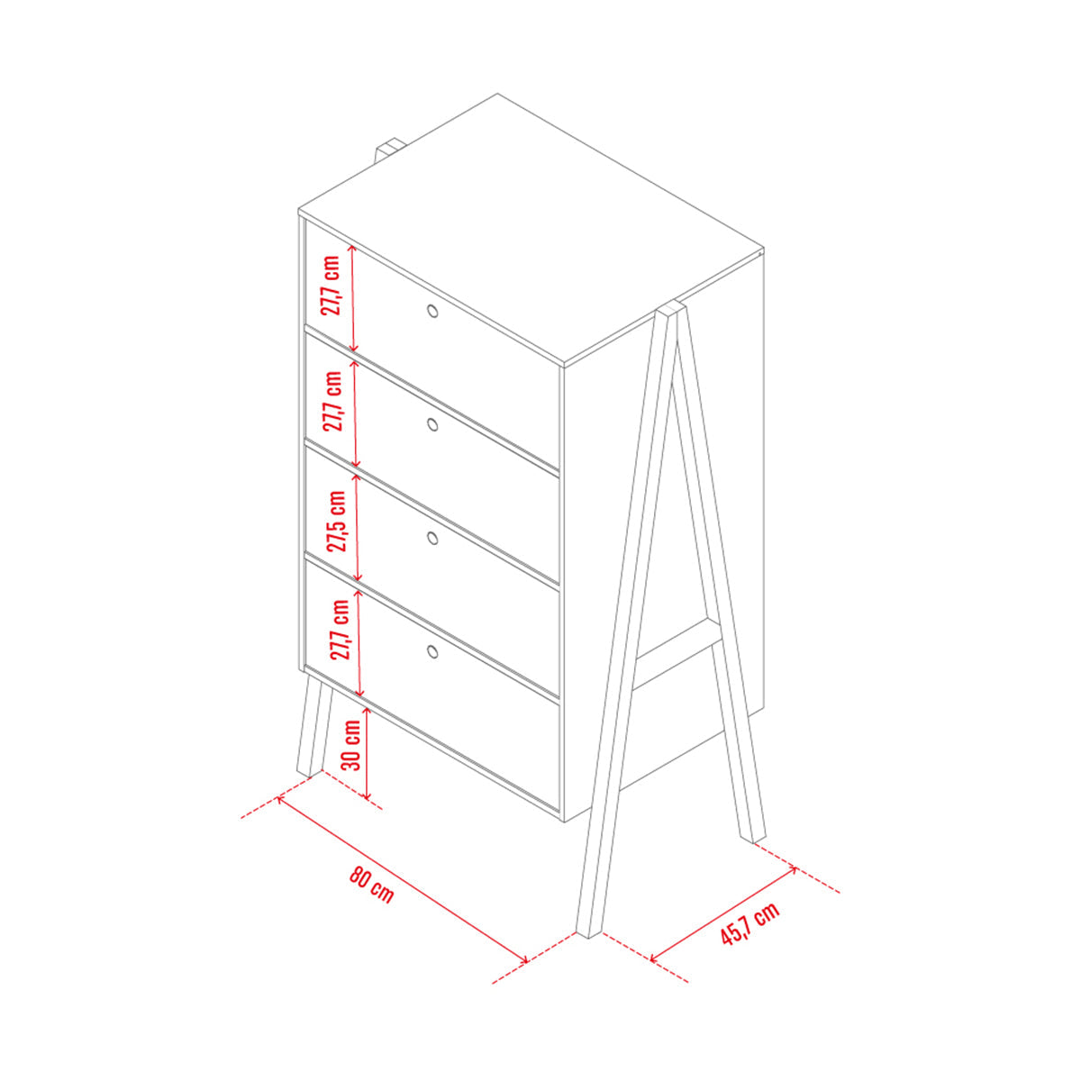 Скринът с четири чекмеджета SPOT може да побере много предмети с различно предназначение. Съдържа 3 дълбоки чекмеджета и контейнер с клапваща врата.