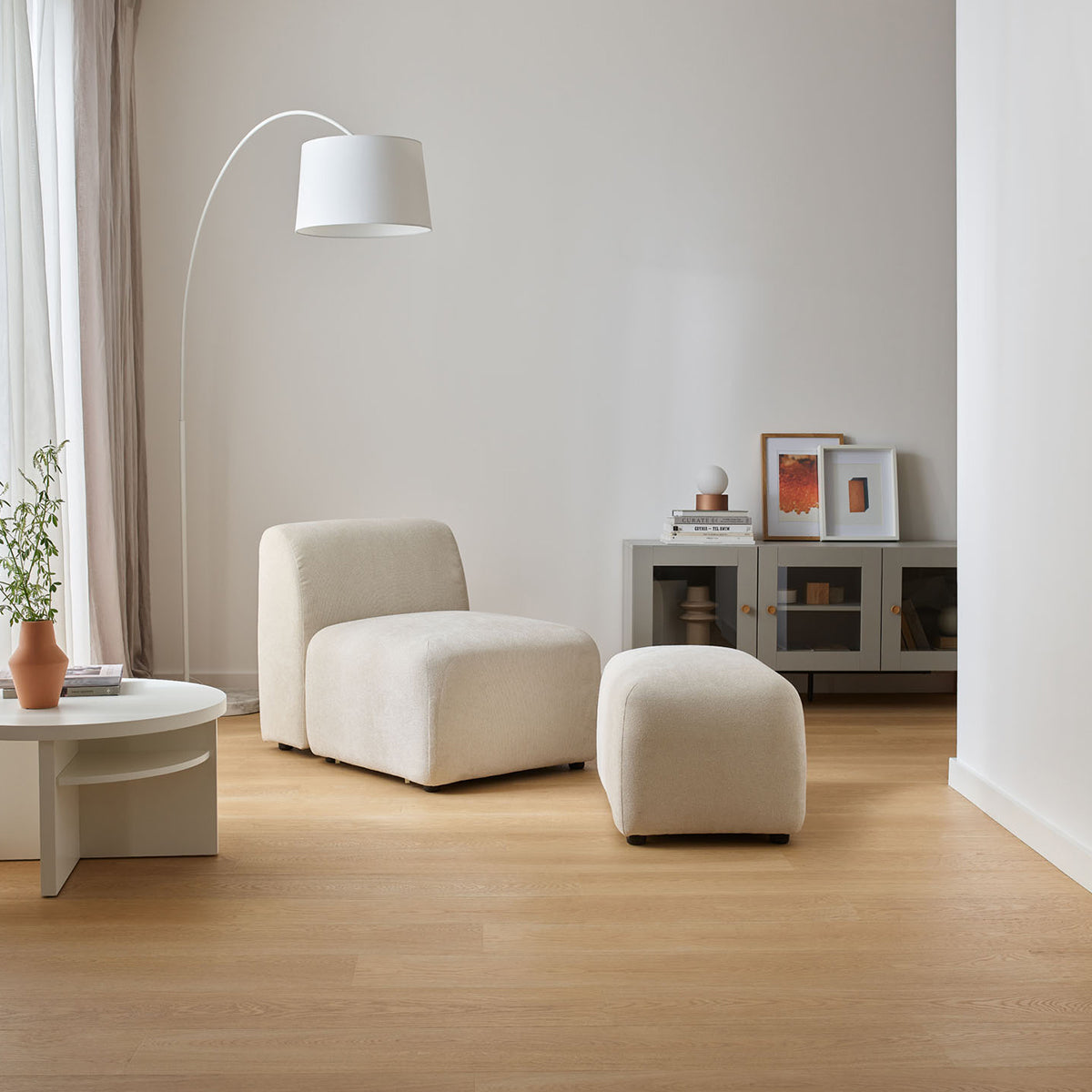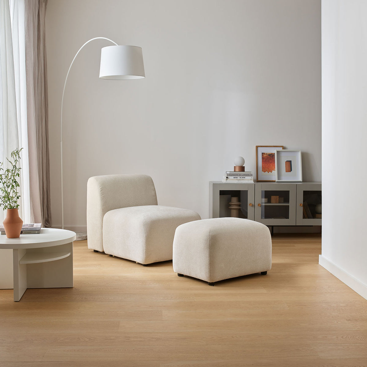 Правоъгълната табуретка от модулната колекция Nui ще служи като мека поставка за крака, допълнителна седалка, а при необходимост и практично място за прибиране на дребни вещи. Благодарение на компактния си размер, тя ще се побере дори в малък интериор. Избирайки любимата си материя за нея, можете лесно да я съобразите с вашия интериорен дизайн.