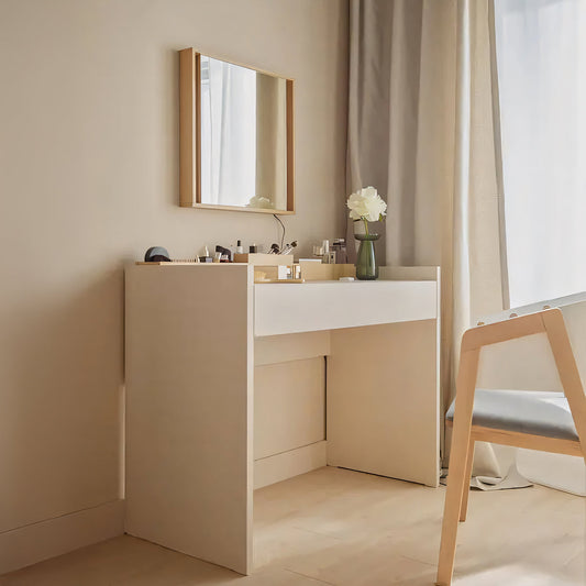 - На плота на тоалетката има функционални органайзери - два ниски и един висок. Благодарение на тях можете удобно да организирате козметика и аксесоари. За да направите плота още по-подреден, в чекмеджето можете да скриете по-ниските предмети;