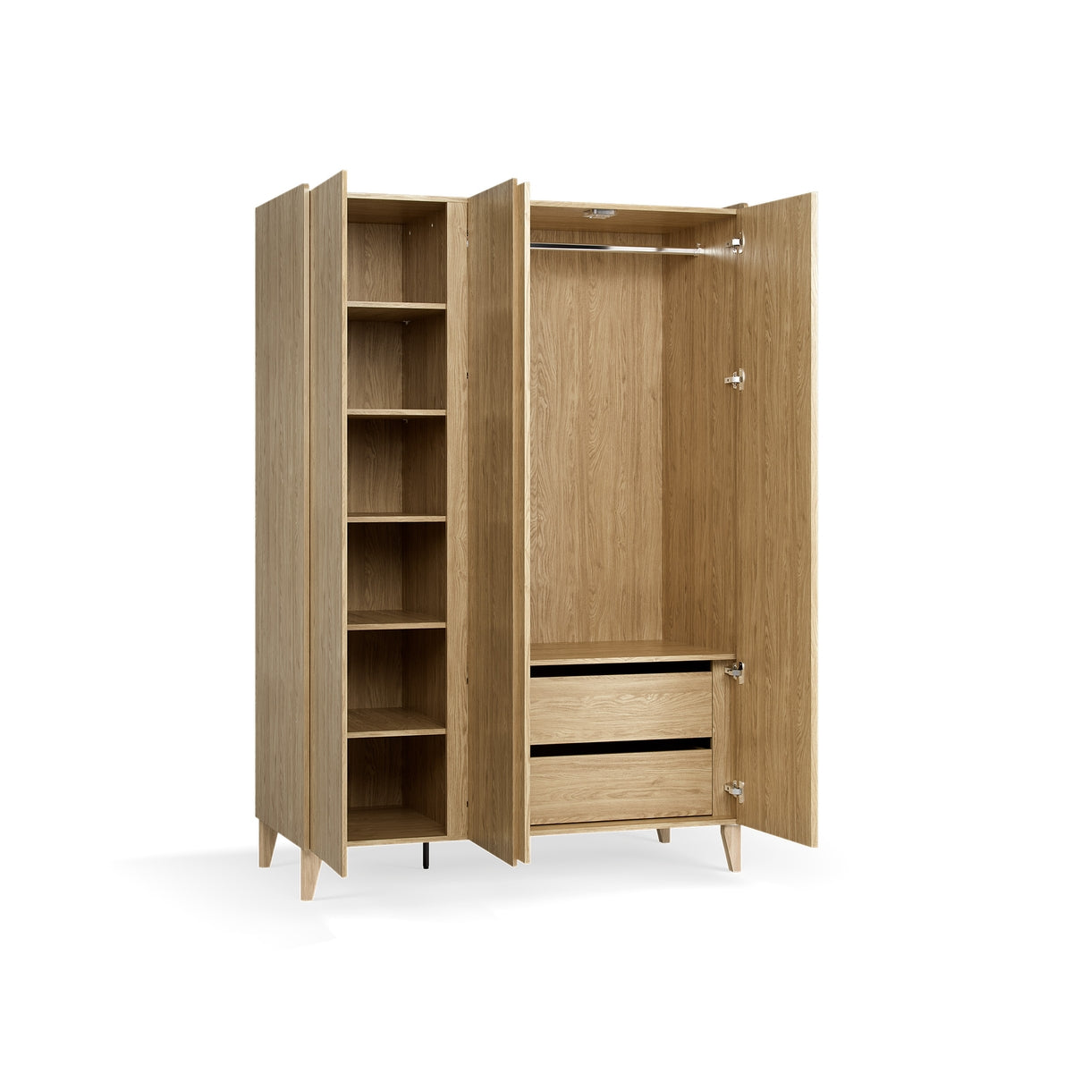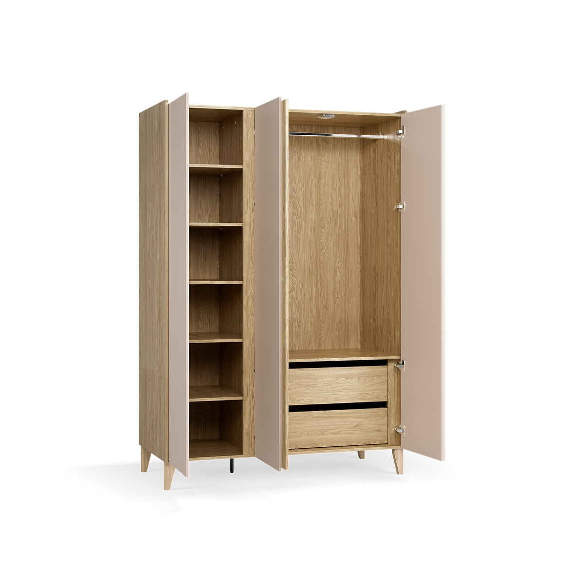 - Състои се от два сегмента:- По-тесният включва регулируеми рафтове- По-широкият е оборудван с висок рафт, дълъг лост за закачалки и 2 чекмеджета