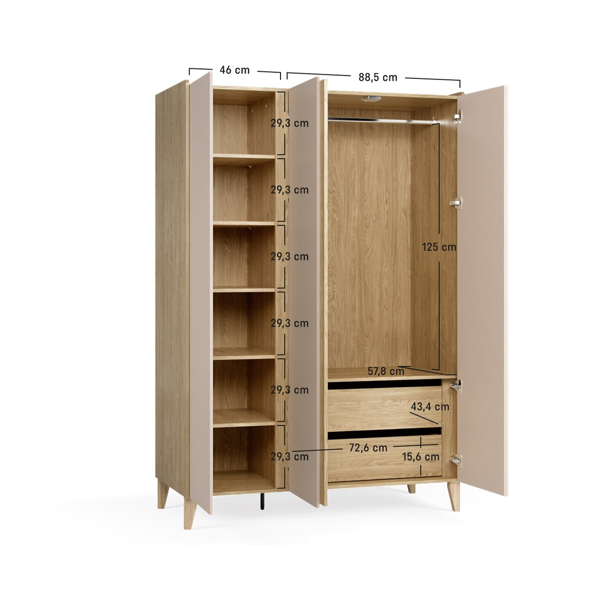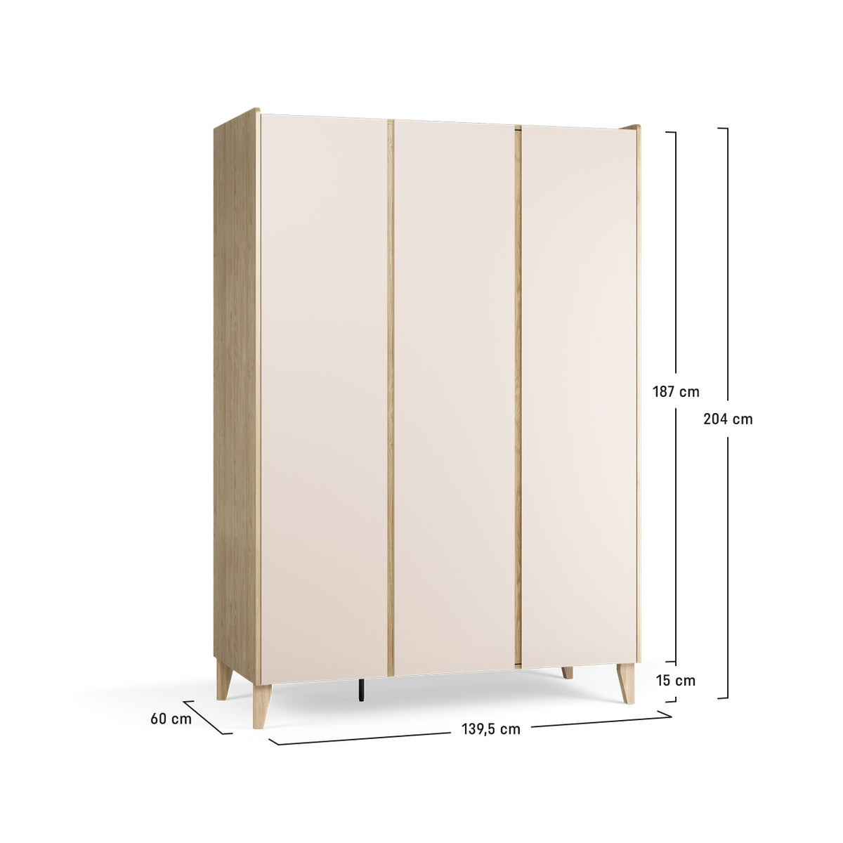15-сантиметрови крака от масивна дървесина – за лесно почистване под гардероба и лек визуален ефект