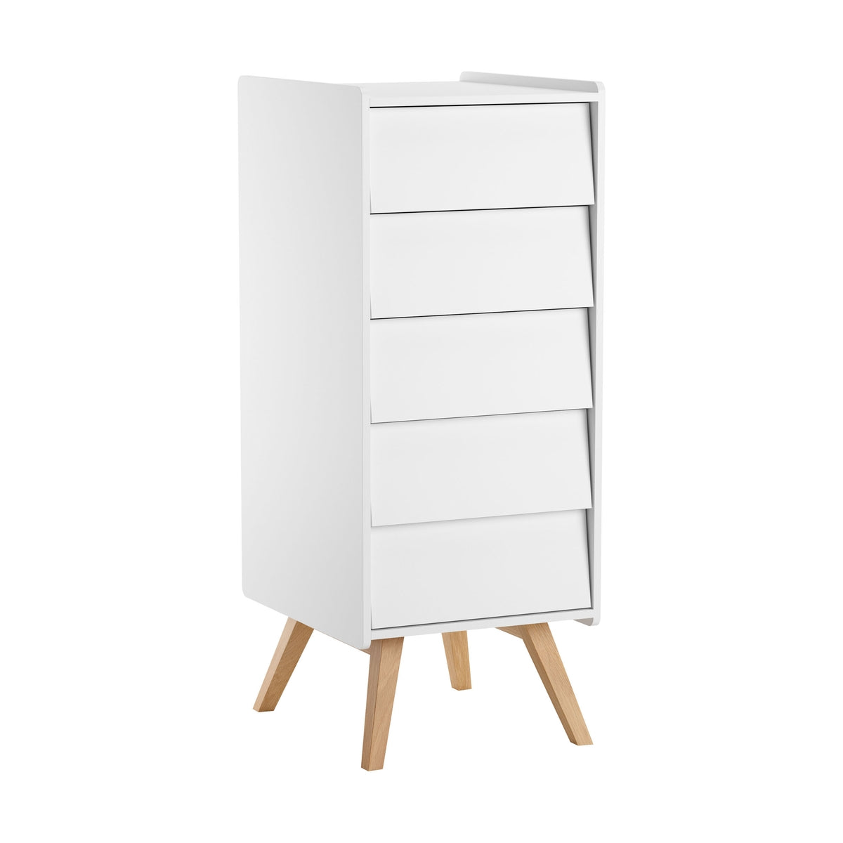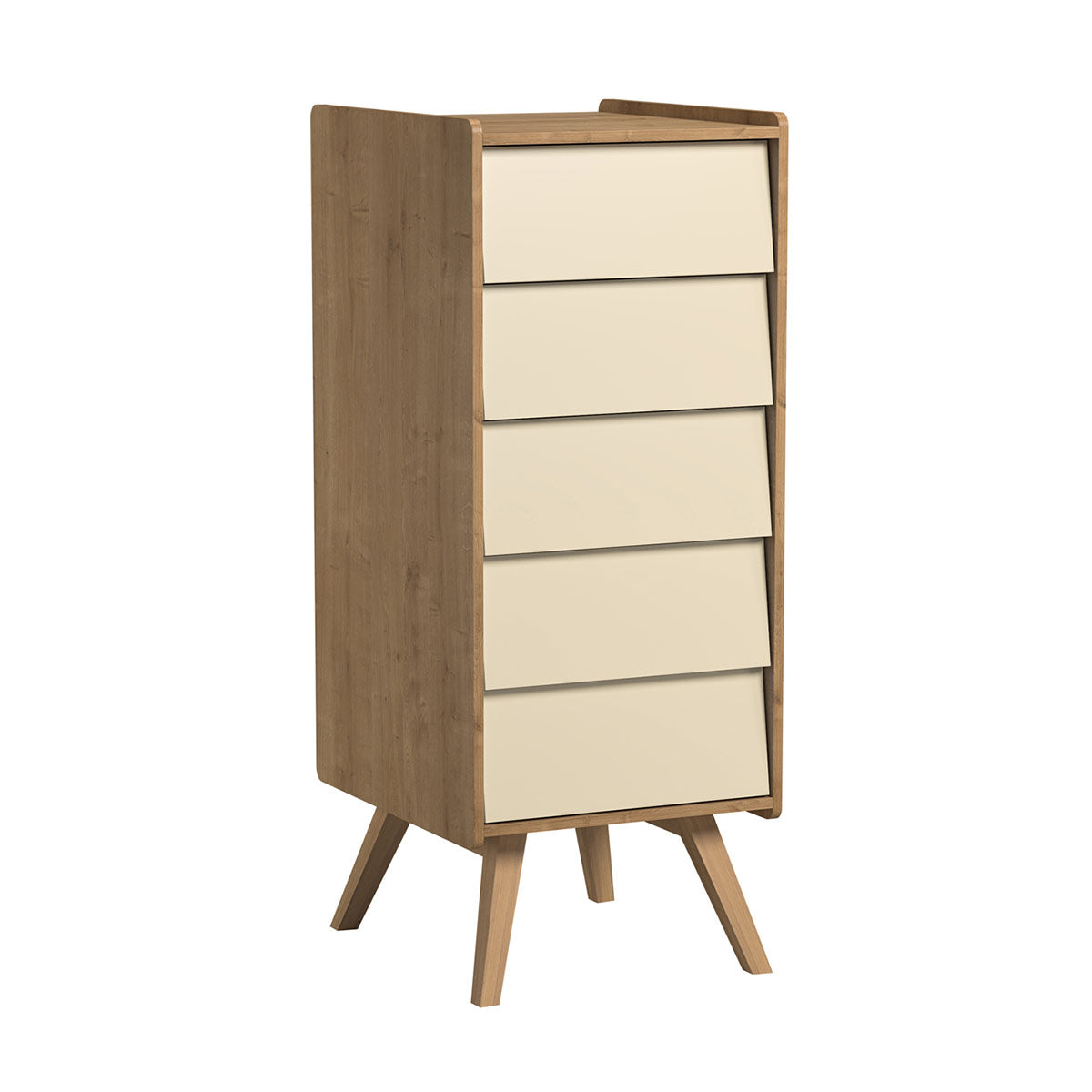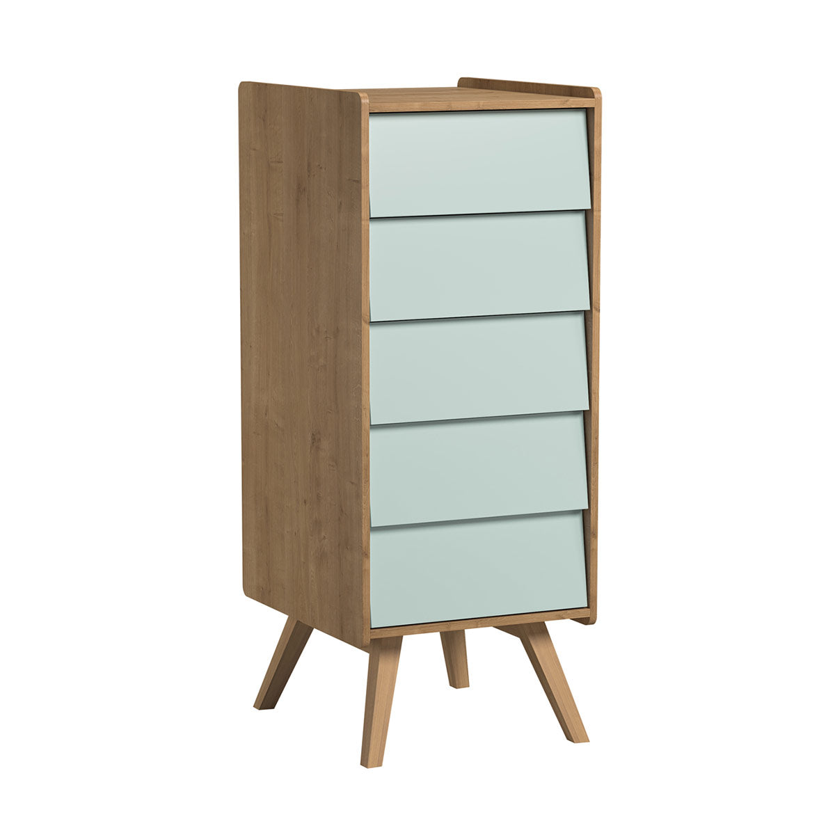 Скринът VINTAGE е тесен и висок, така че не заема много място.В петте чекмеджета можете да подредите удобно детските дрехи и аксесоари;